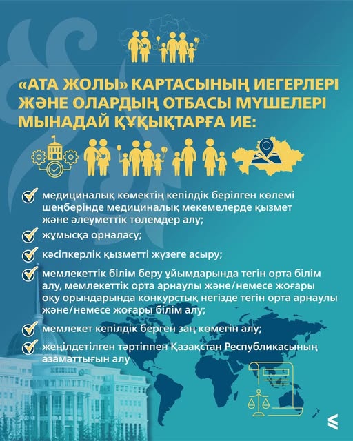«Ата жолы» картасы бар этникалық қазақ басқа елдің азаматы бола отырып, Қазақстан азаматтарымен және қандастармен тең құқықтарға ие.