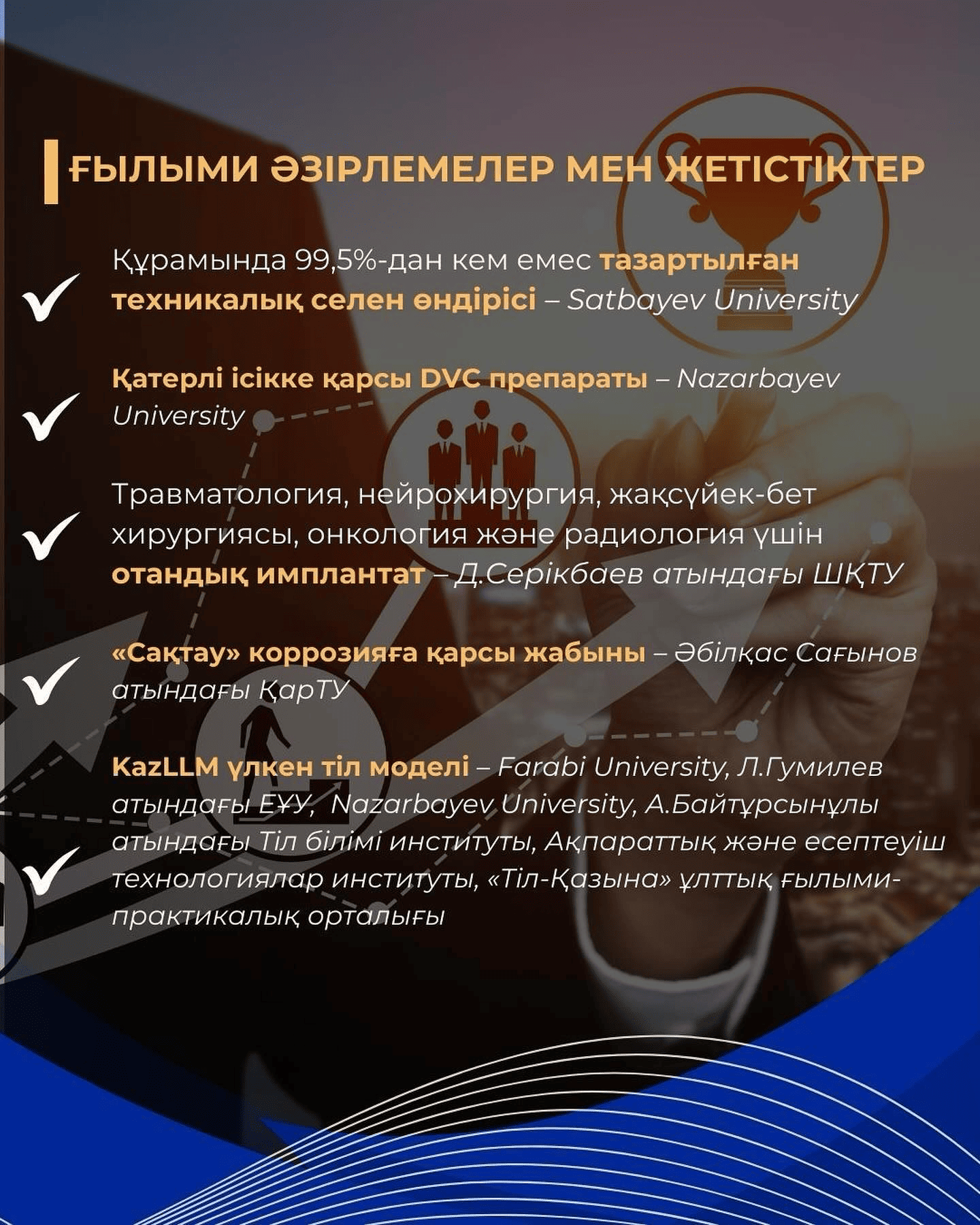 Мемлекет басшысының әлемнің жетекші зерттеу орталықтарында 500 ғалымның жыл сайынғы тағылымдамадан өтуін қамтамасыз ету туралы тапсырмасын орындау үшін шетелде ғылыми тағылымдамалар бағдарламасы іске қосылды. Бүгінгі таңда осы тапсырманы іске асыру аясында 1475 тағылымдама берілді.