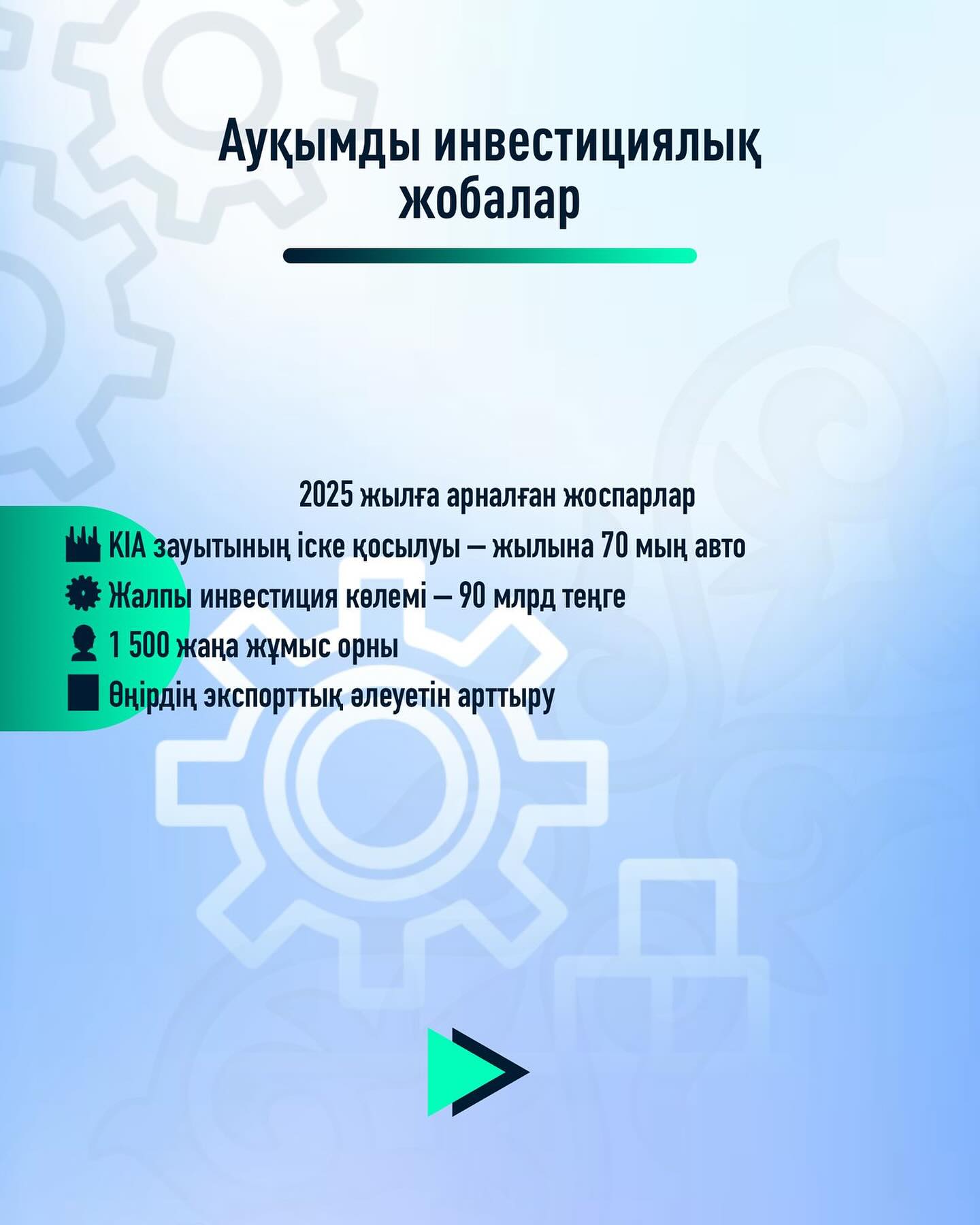 Бұдан бөлек, «KamLitKZ» ЖШС металлургия кластерін дамыту аясында биыл тағы 2 жобаны іске қосуды жоспарлап отыр. Олар – жетекші көпірлердің басты берілістерін өндіру және жүк көліктеріне арналған жетекші көпір балкасын тереңдетілген локализациямен шығару. Жобалардың өндірістік қуаты – жылына 74 мың редуктор және 90 мың көпір балкасы, жалпы инвестиция көлемі – 160,5 млрд теңге, 650 жұмыс орны құрылады.